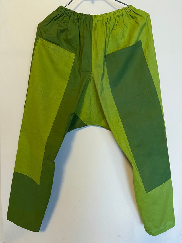 note.でも紹介した、「さるっぱかま」改名、MARIPPAKAMAです。 https://note.com/mari_nee/n/n19da0c17d52d 男物の着物は裏に木綿を使っているものが多くあります。その中でテクスチャ感が合う、二色の生地を選んでみました。カエルっぽい色合いになりましたのでカエル好きな方なら嬉しいんじゃないかな。膝当ての上部を開けて、ポケットにしてあります。(ちゃんと途中で留めてあります〜)割と軽いので夏の暑い時期にTシャツや風の通るブラウスなどを合わせてお召しいただけたらいいんじゃないかと思います。 二着分の量があったので、だったら、合わせるパーツを色違いにしたら楽しいな、と思って作り始めましたが、出来上がってみたら、なぜか二種類のデザインになっていました。(^ ^;) こちらはベースを左右で色分けしたので、すっきりした後ろ姿になります。もう一方(MARIPPAKAMA(木綿古布・胴裏地)05)は前後左右で色を変えてあります。 ジャストウエスト、というより、少しルーズな感じに着ると緩い感じが出て、いいんじゃないかと思います。ふくらはぎサイズは必ず測ってご検討ください。 総丈:約88センチ 胴回り:約124センチ ふくらはぎ(ここ重要です)周り:40センチ 足首周り:32センチ ウエストゴムですので、おおよそ、58センチから68センチくらいの方は問題なく着用いただけると思います。ご自分で調節できるよう、ゴム通し穴をつけてあります。