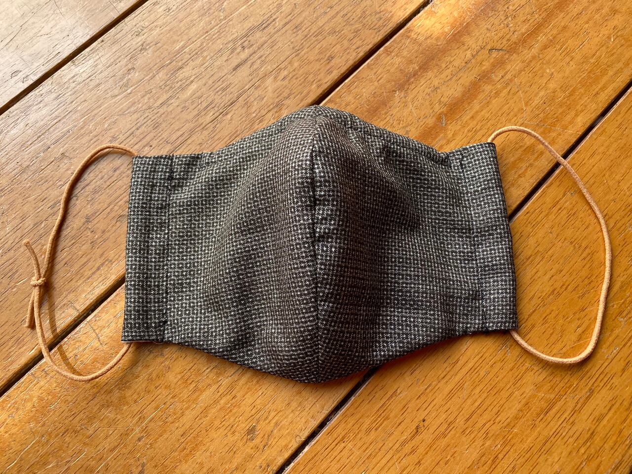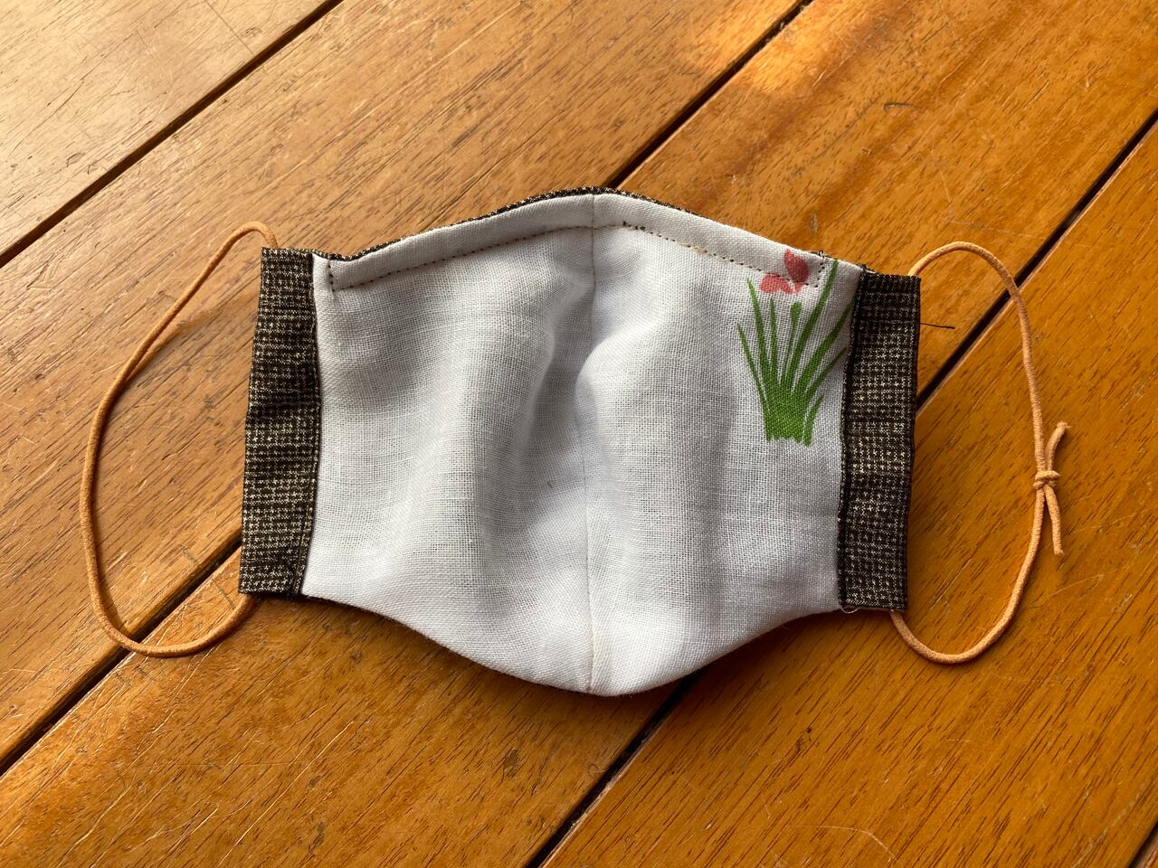 鼻ワイヤー(市販の不織布マスクのものと同じ素材)入り。サイドダーツなし。こちらはゴムを好きなサイズに結んでお使いいただける仕様になっています。結び目はマスクの折り目の中に入れ込んでお使いください。(片方の結び目を外に出してお届けいたします。)ゴムは紅茶で染め、柔らかいピンク系ベージュになっております。比較的薄く、軽やかなつけ心地です。