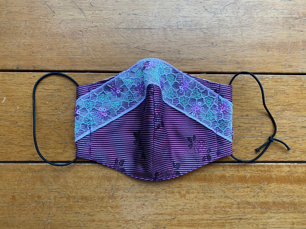 和古布(お召)で作ったマスク。正絹 裏地はダブルガーゼ。綿100% 二枚のうち一枚をポケットになるように仕立ててあります。装飾:シフォンリボン スパンコール