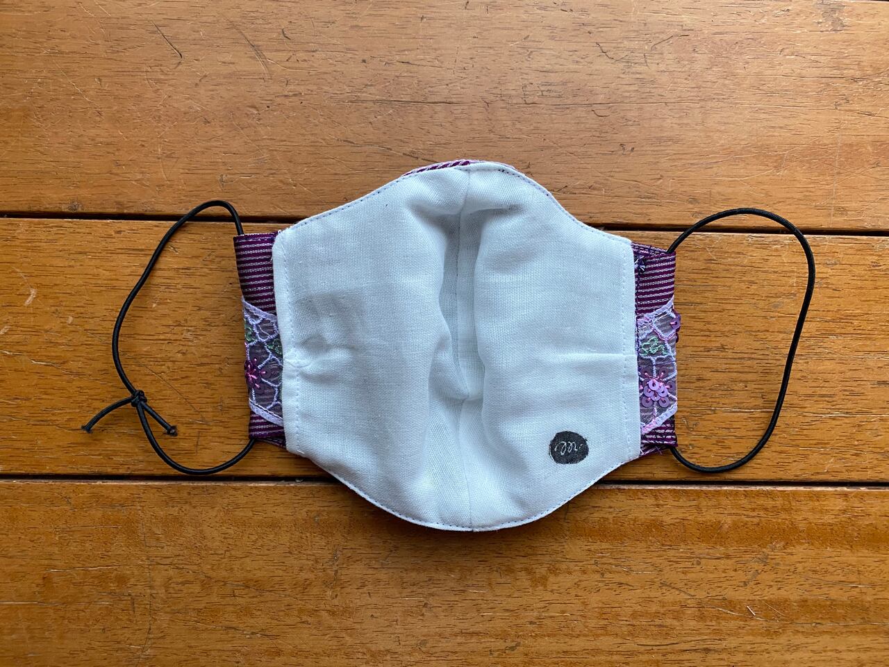 こちらはゴムを好きなサイズに結んでお使いいただける仕様になっています。結び目をマスクの折り目の中に入れてください。片側のゴムの結び目を外に出してお届けいたします。内側ポケット付き。内側に不織布などの機能のある素材を入れてくださることで効果を出すことが期待できます。検品時にA2ケアスプレーで除菌してからパッケージしています。
