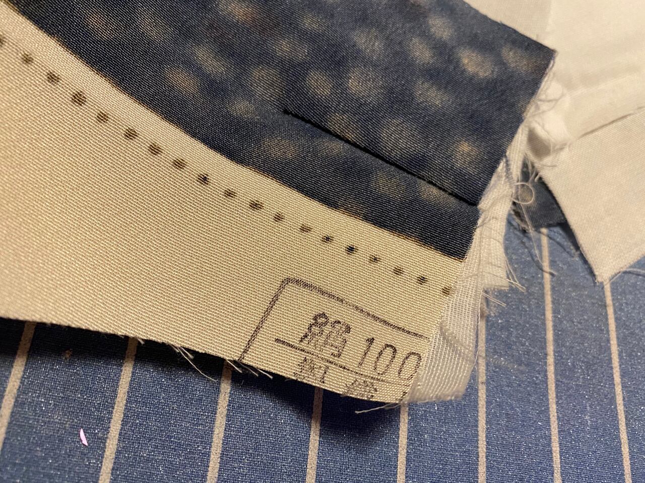 和古布(お召)で作ったマスク。正絹100% 反物の端を利用して柄を作りました。折り目の裏側の端に証印の「絹」の文字がのぞいております。裏地はダブルガーゼをさらに2枚重ねました。綿100% 裏地のうち一枚をポケットになるように仕立てております。