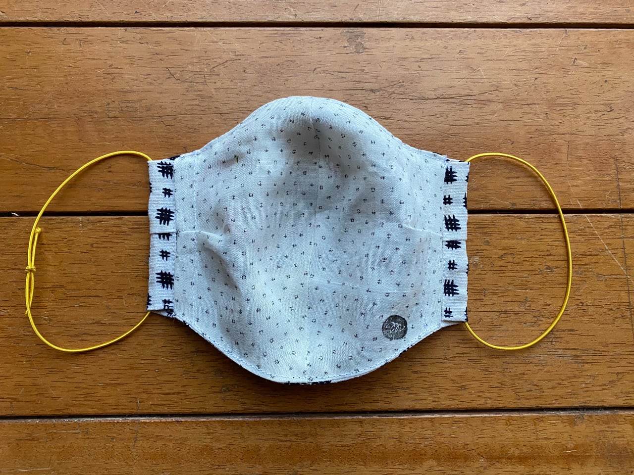 こちらはゴムを好きなサイズに結んでお使いいただける仕様になっています。結び目はマスクの折り目の中に入れてご使用ください。片方の結び目を出した状態でお届けします。
