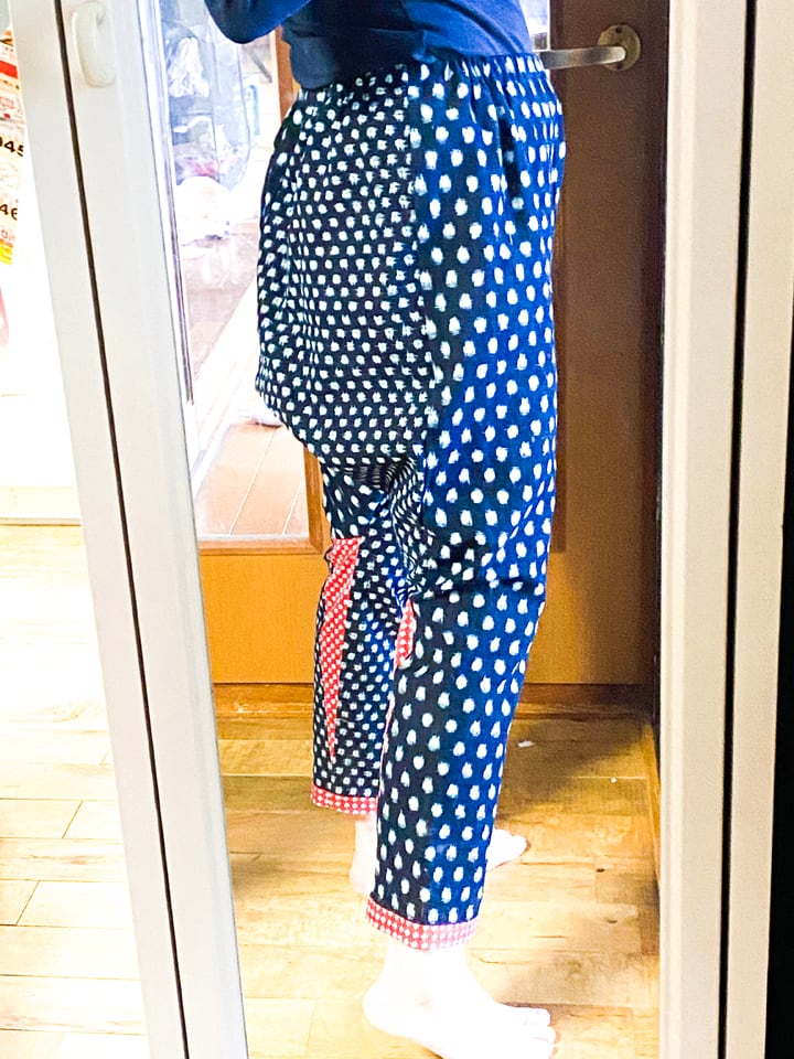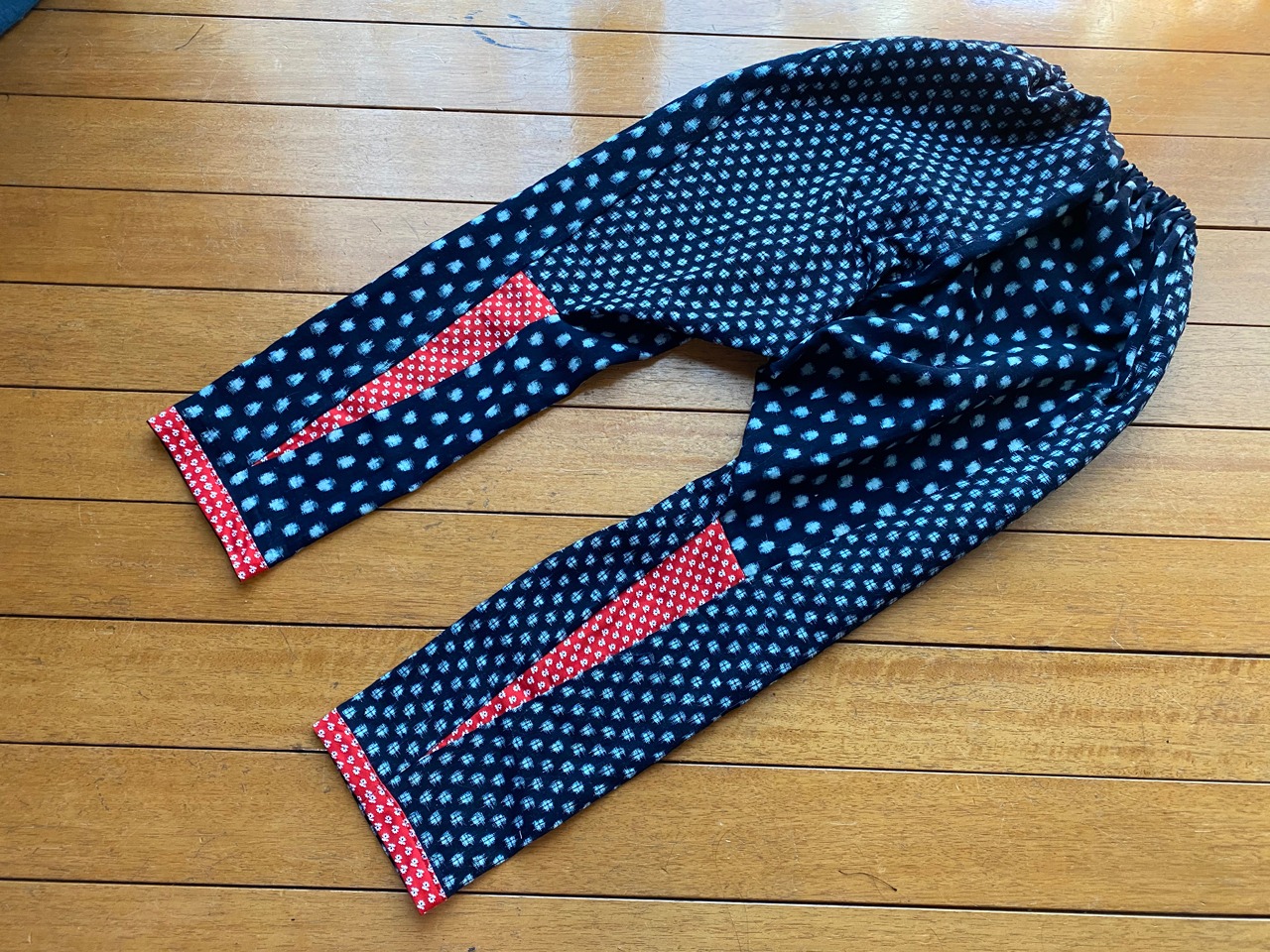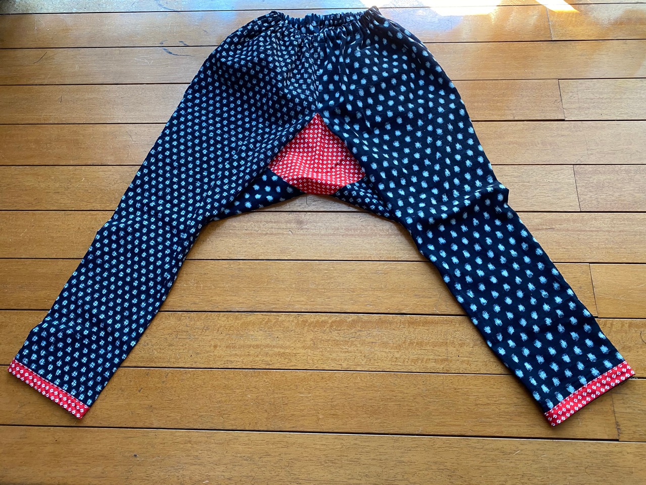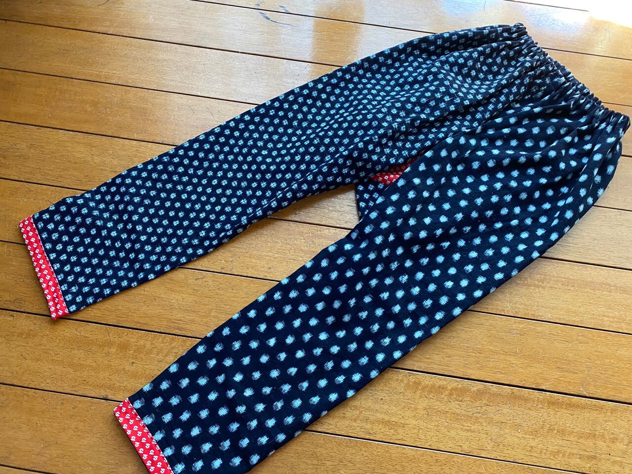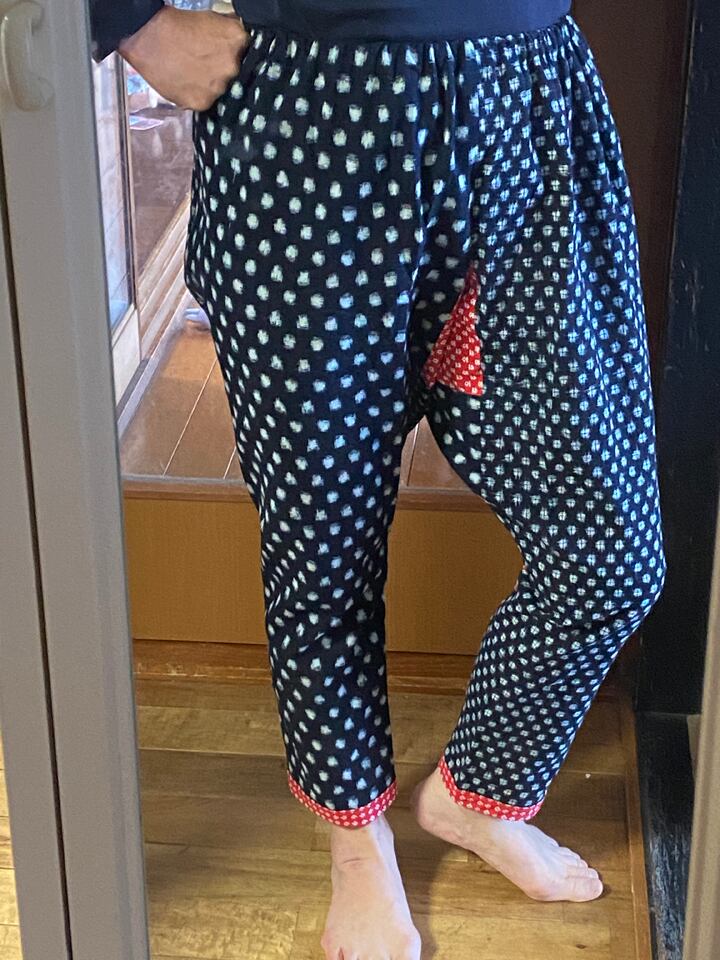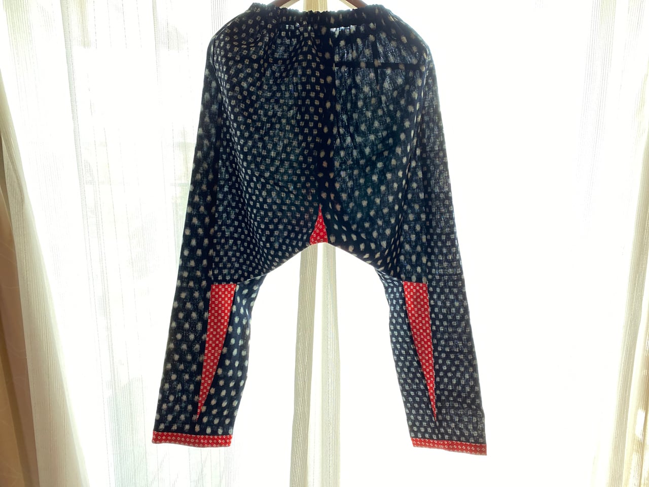 柄の違う二着の木綿の久留米絣の着物を解体してリメイクしました。そのままではいかにも「野良着」なので、赤いプリント地をアクセントに使いました。
