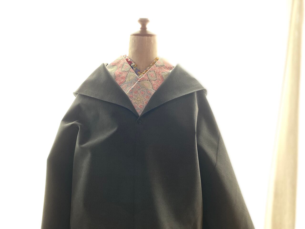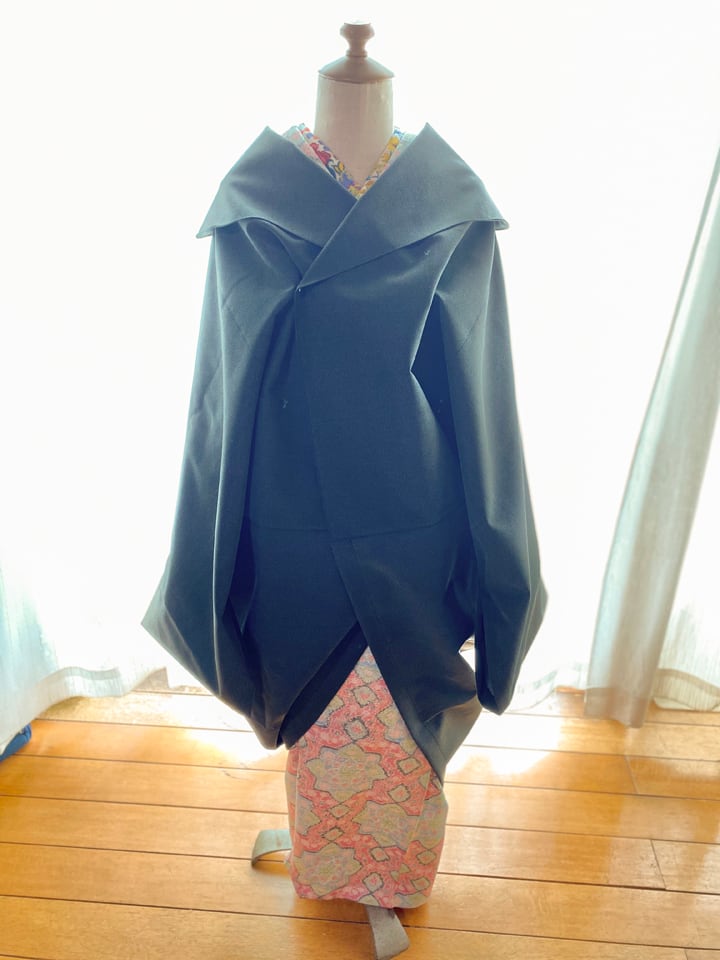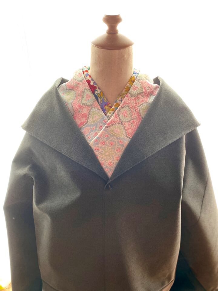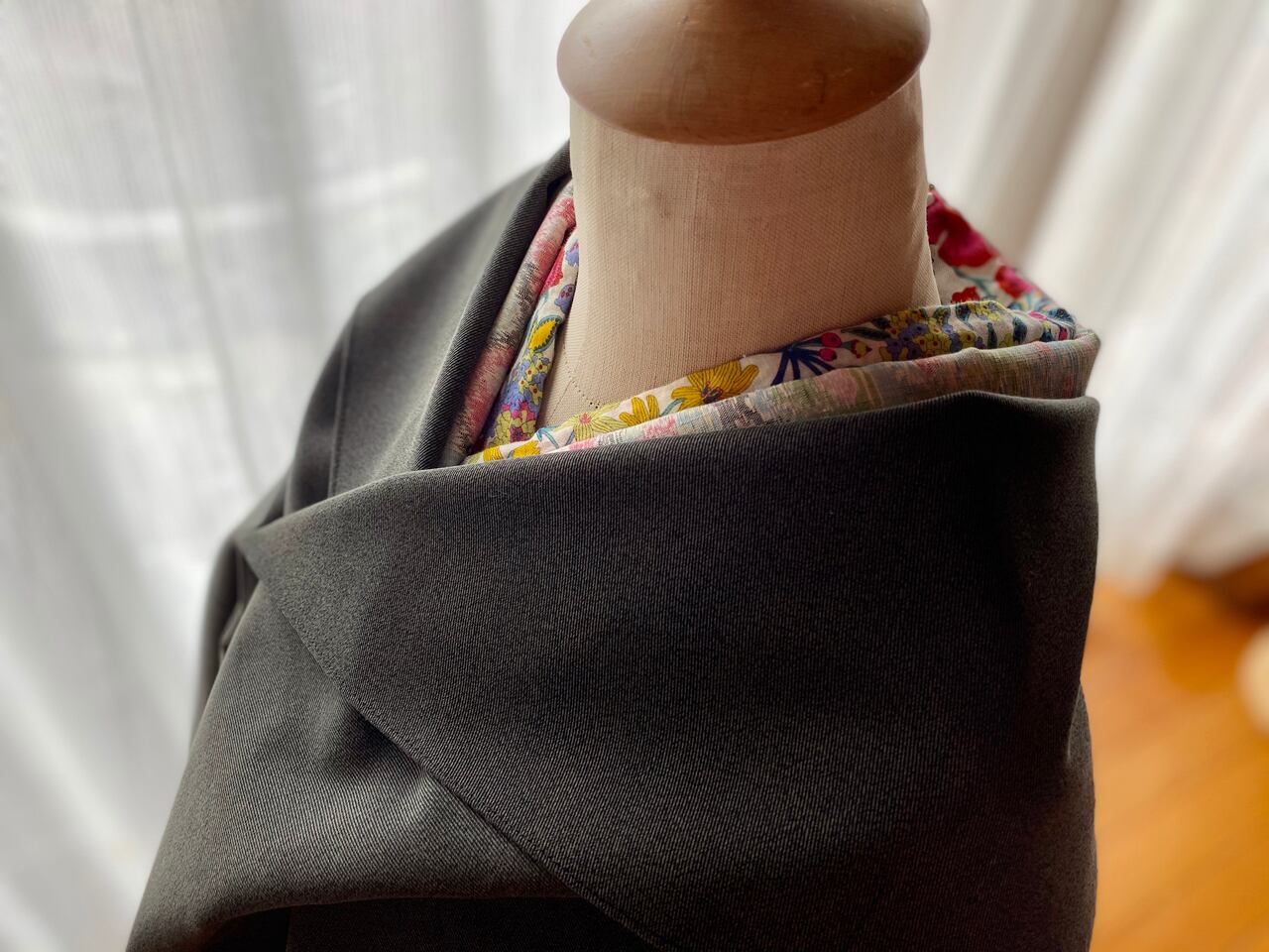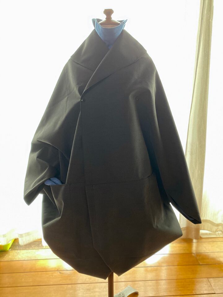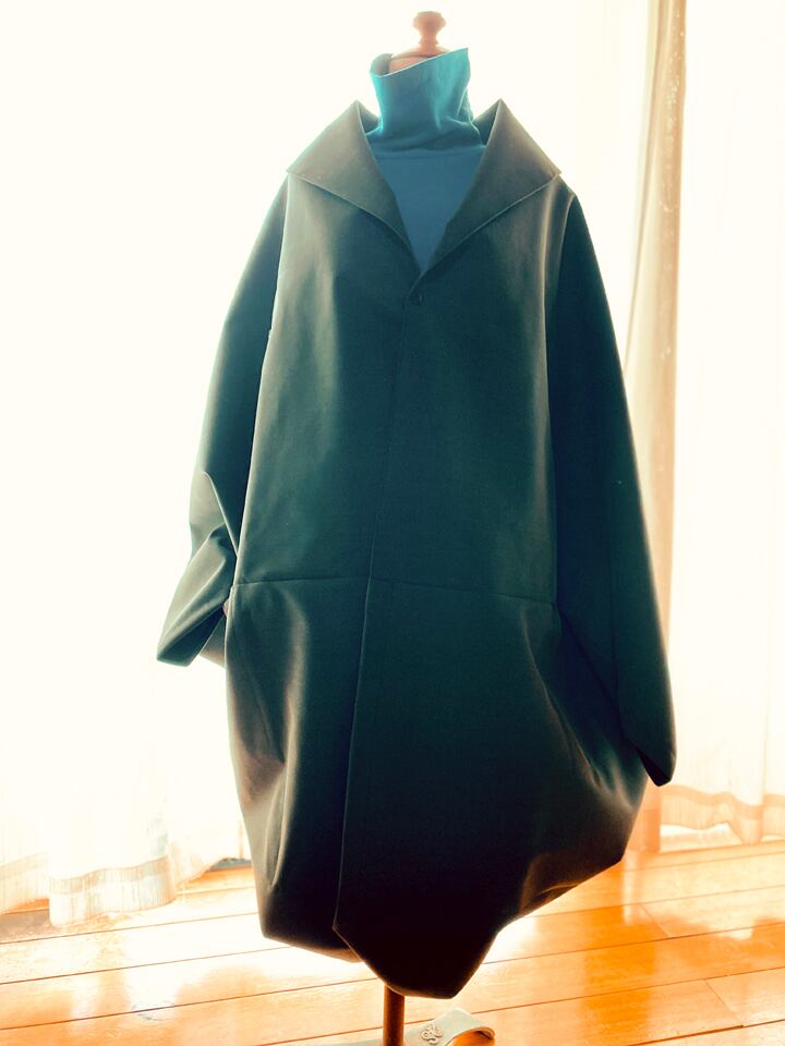 パターンを作らずに四角い布だけでできていますので、着る人の衣紋の抜き方や体型でシルエットが変わっていきます。前のホックをダブルにするか、シングルにするか、また首の後ろのボタンと裾中央のホックを調整することでも形を変えて着ることができます。