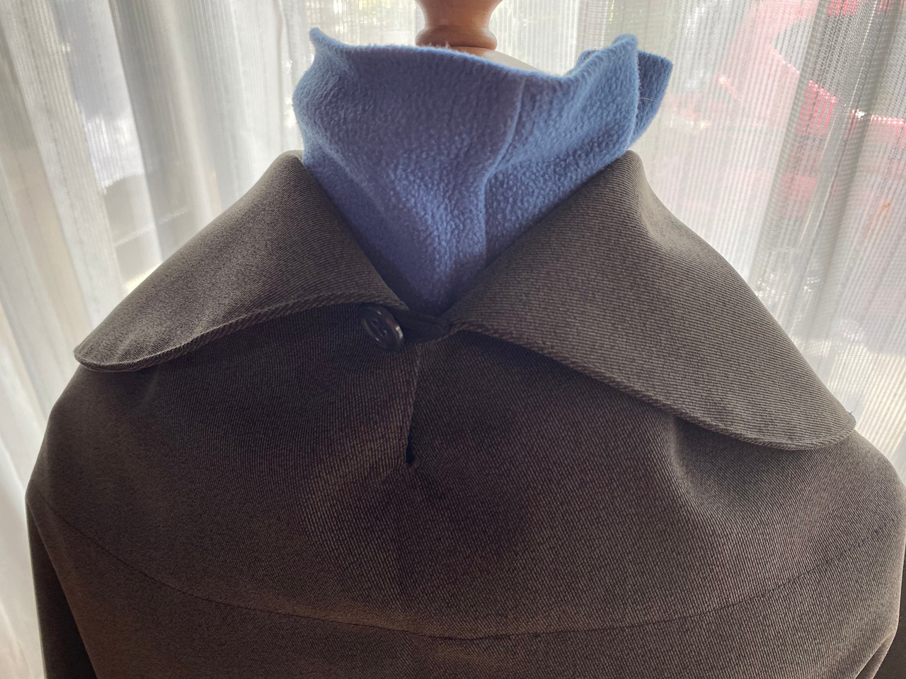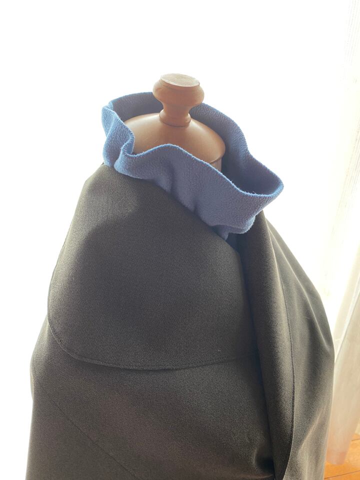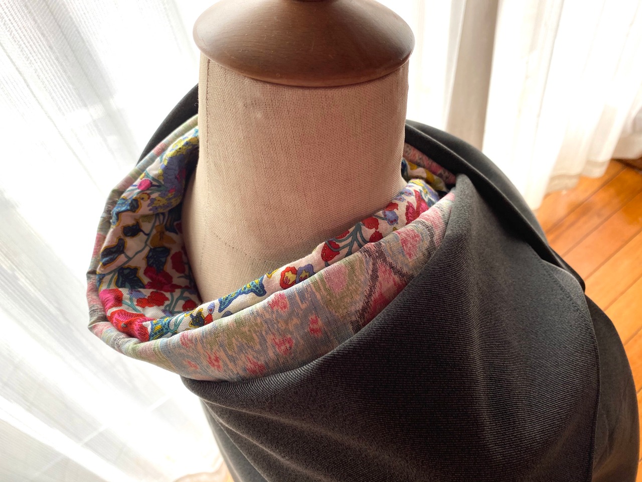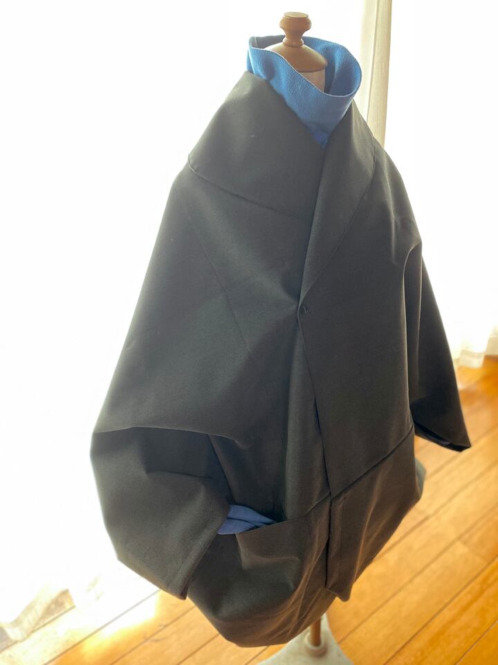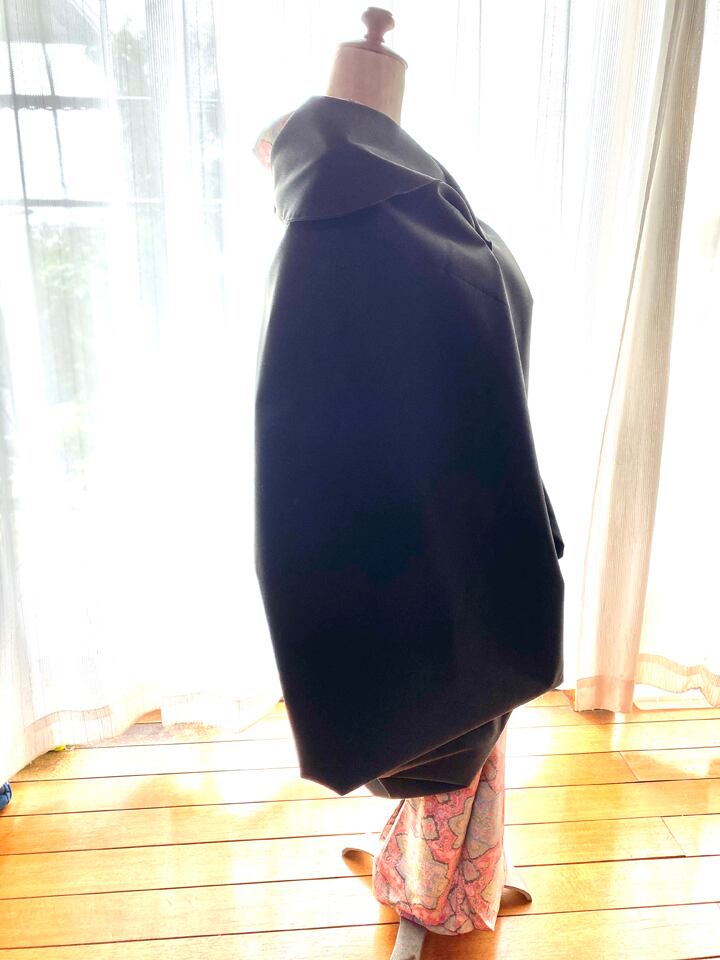 パターンを作らずに四角い布だけでできていますので、着る人の衣紋の抜き方や体型でシルエットが変わっていきます。前のホックをダブルにするか、シングルにするか、また首の後ろのボタンと裾中央のホックを調整することでも形を変えて着ることができます。