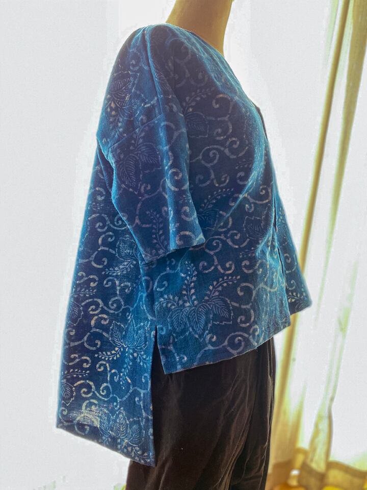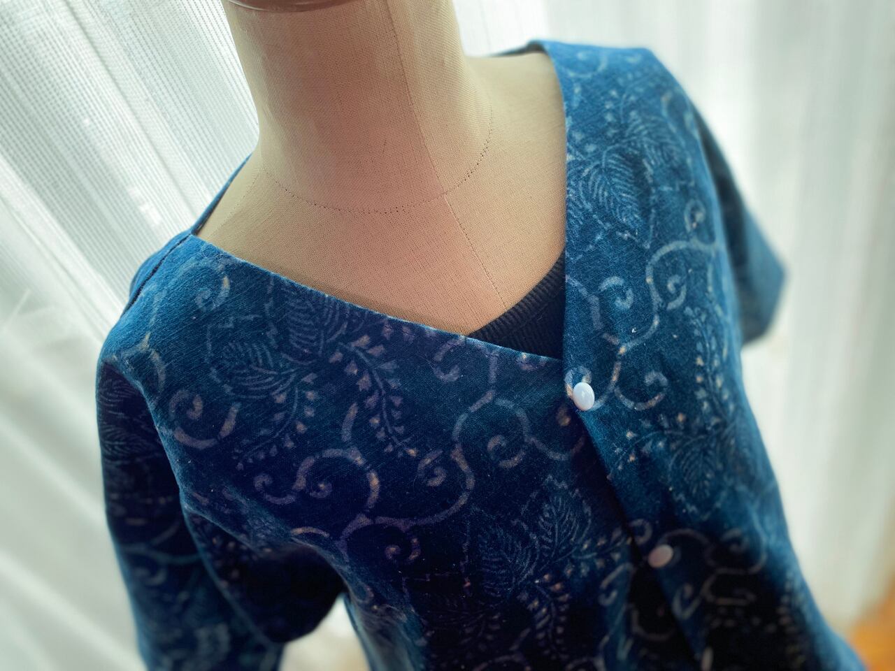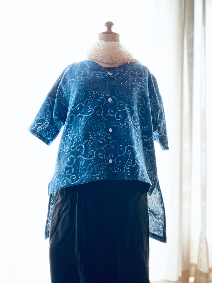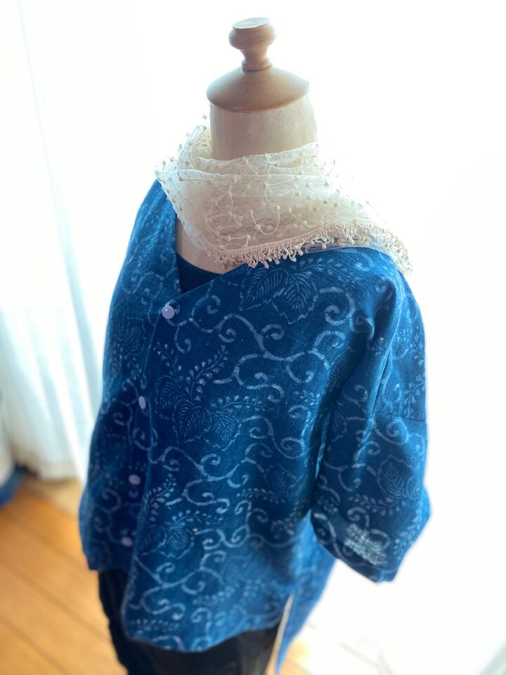 木綿の古布を使ったブラウス。長く着ていた着物を解いた布です。おそらく藍染でしょう。柔らかく、肌触りの良さは、時間が育てたものと言えるでしょう。コレクターの方には価値の高さをお分かりいただけると思います。今回は外しましたが、丁寧に穴を繕った箇所もありました。表面は場所によって日焼けが気になったので、あえて裏を使いました。染が微妙にボケているのも良い味になっています。