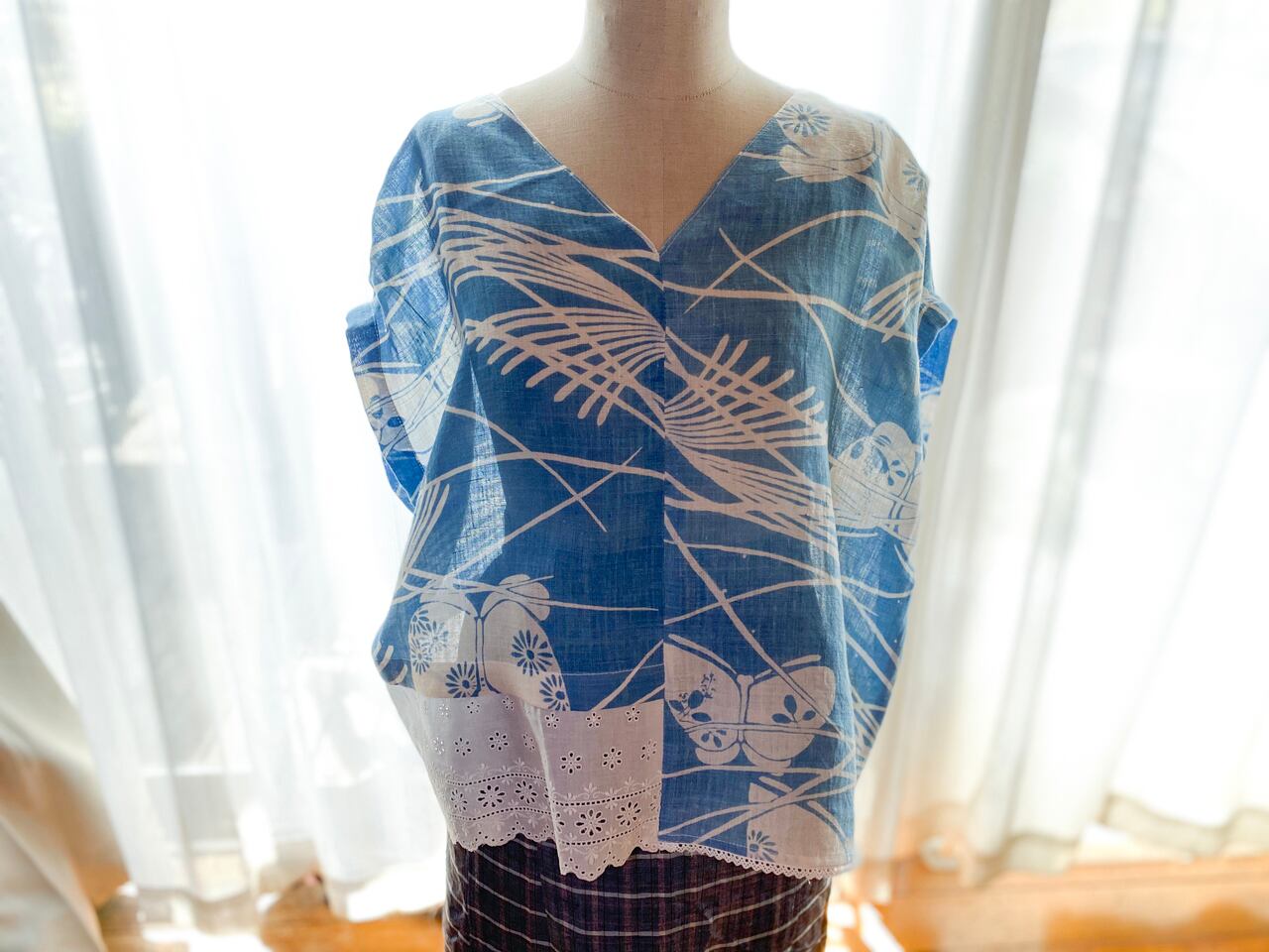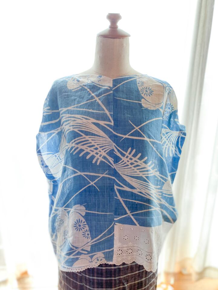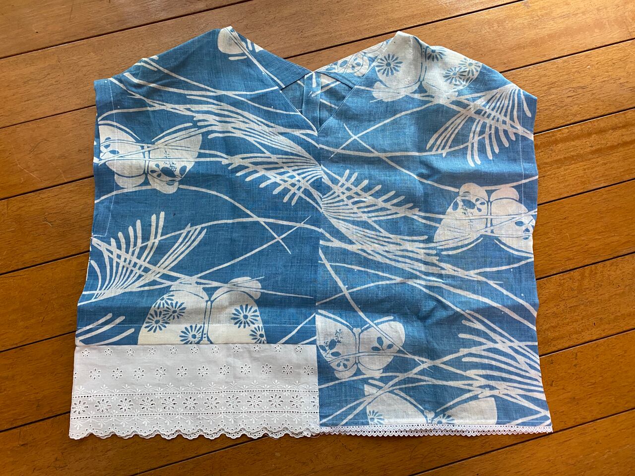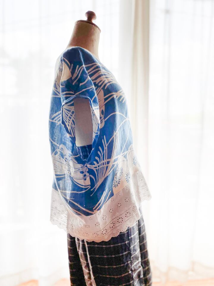 本麻に藍で型染した古布。ほんの少ししか手に入らなかったので、その少ない量でどんなものができるかチャレンジしました。元々あった布地は長さの違う二枚。だから、短い方に幅のある木綿のレースを足してみました。布は切り取りたくないので、折って襟ぐりを出します。この形だと前後、どちらに着てもいいんです。お好きな方で、アクセサリーやジャケットに合わせて変えてみてください。
