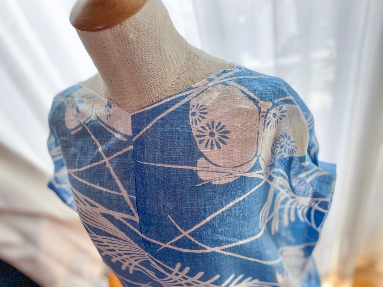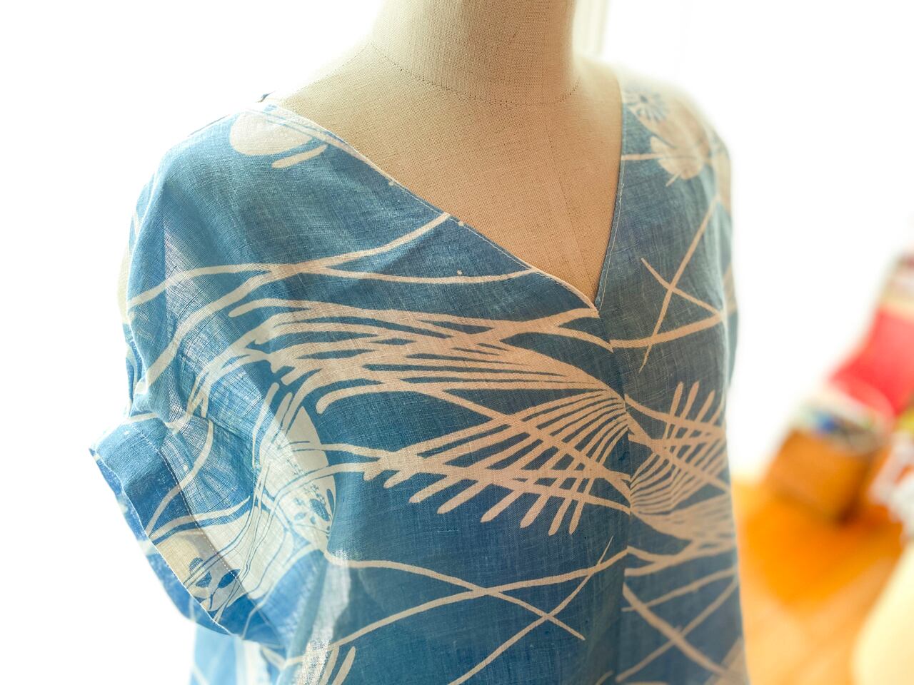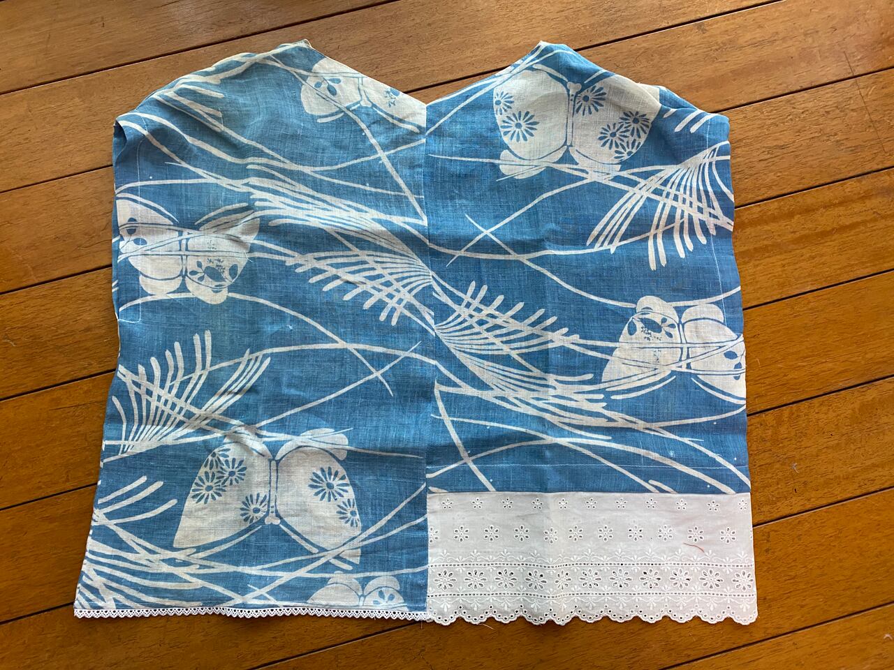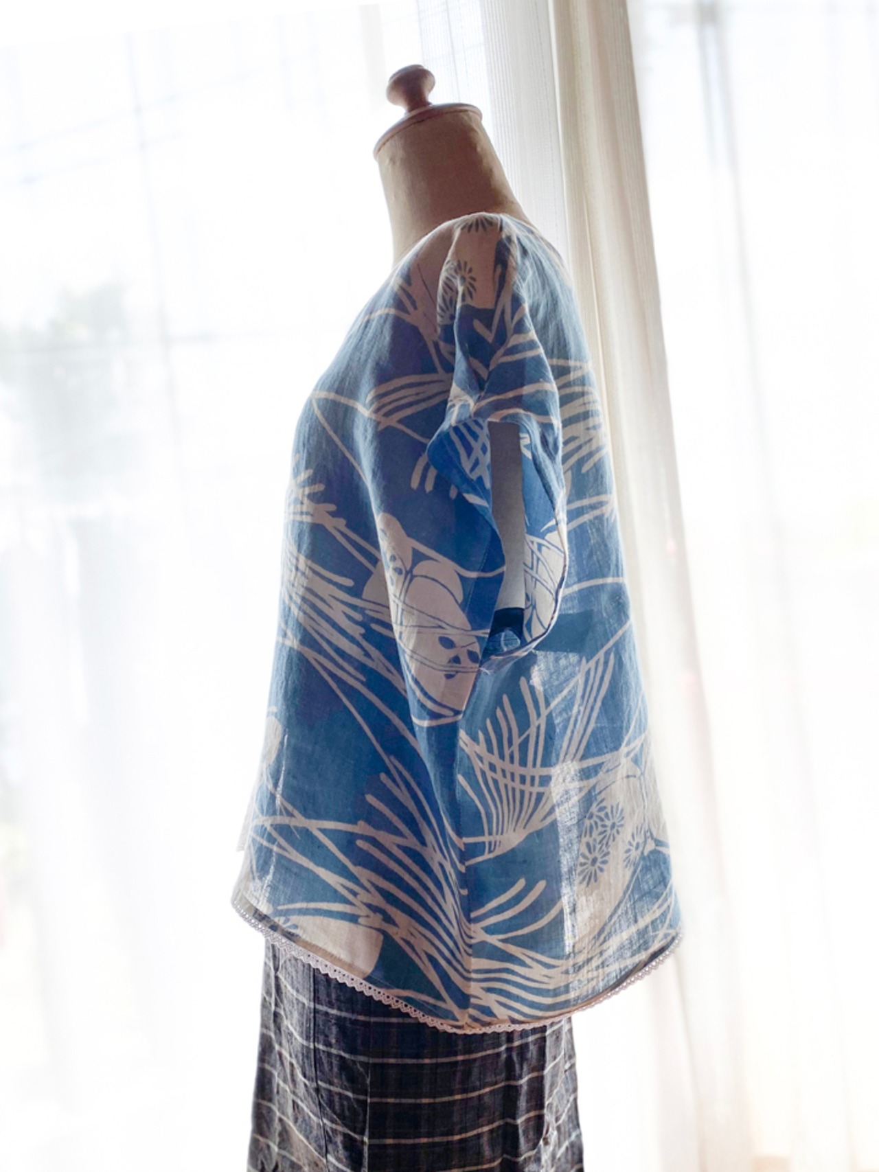 本麻に藍で型染した古布。ほんの少ししか手に入らなかったので、その少ない量でどんなものができるかチャレンジしました。元々あった布地は長さの違う二枚。だから、短い方に幅のある木綿のレースを足してみました。布は切り取りたくないので、折って襟ぐりを出します。この形だと前後、どちらに着てもいいんです。お好きな方で、アクセサリーやジャケットに合わせて変えてみてください。