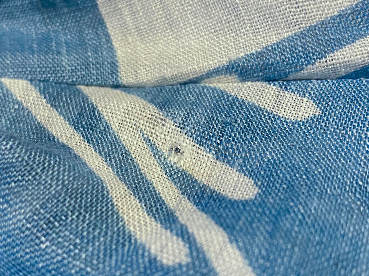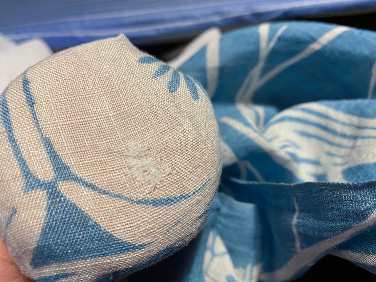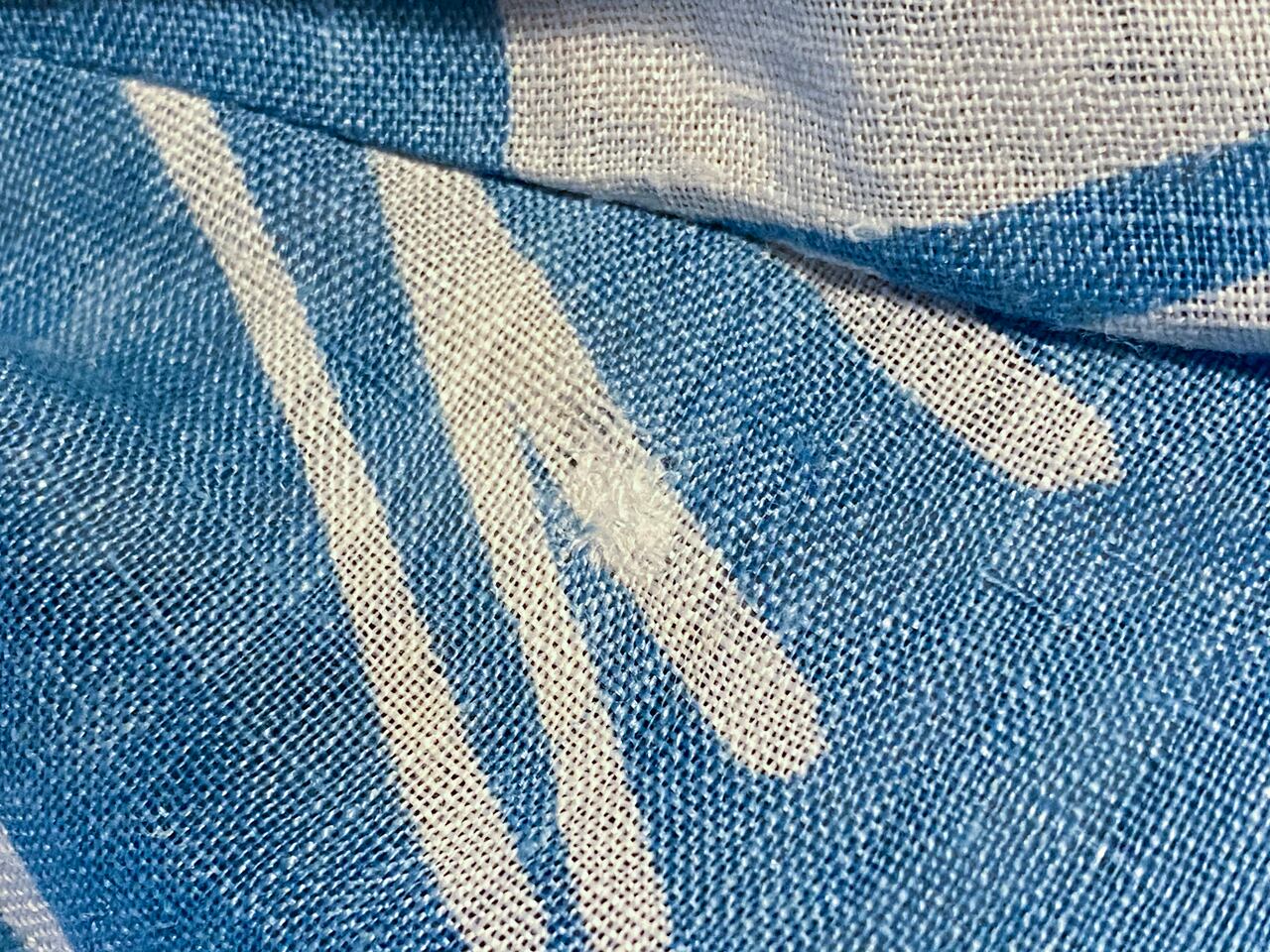 古い布ですので、織り傷、縫い傷がありました。見つけたところは一つ、ひとつ縫繕って目立たぬようにしてあります。これも古い布の持ってきた歴史のようなもの、と味わいの一つにしてください。
