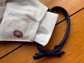 こちらはゴムを好きなサイズに結んでお使いいただける仕様になっています。結び目はマスクの折り目の中に入れてご使用ください。片方の結び目を出した状態でお届けします。