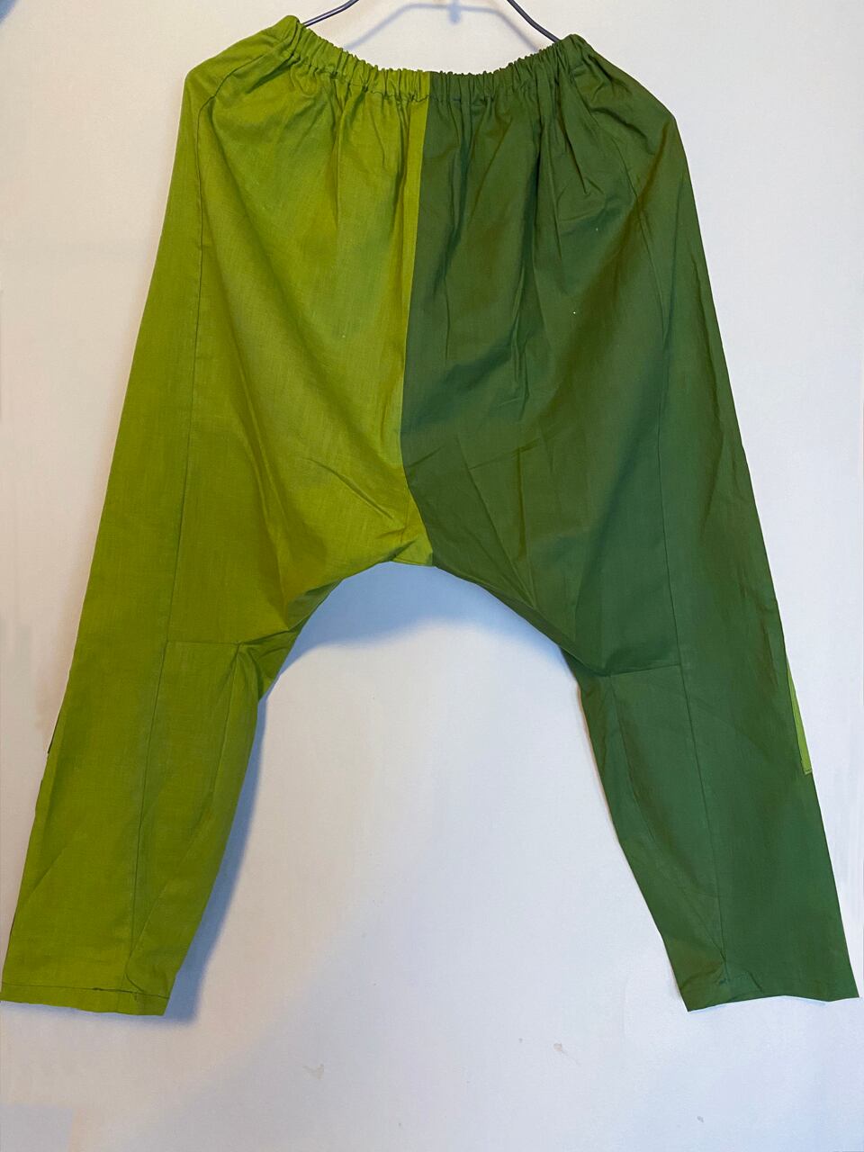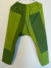 男物の着物は裏に木綿を使っているものが多くあります。その中でテクスチャ感が合う、二色の生地を選んでみました。カエルっぽい色合いになりましたのでカエル好きな方なら嬉しいんじゃないかな。膝当ての上部を開けて、ポケットにしてあります。(ちゃんと途中で留めてあります〜)割と軽いので夏の暑い時期にTシャツや風の通るブラウスなどを合わせてお召しいただけたらいいんじゃないかと思います。