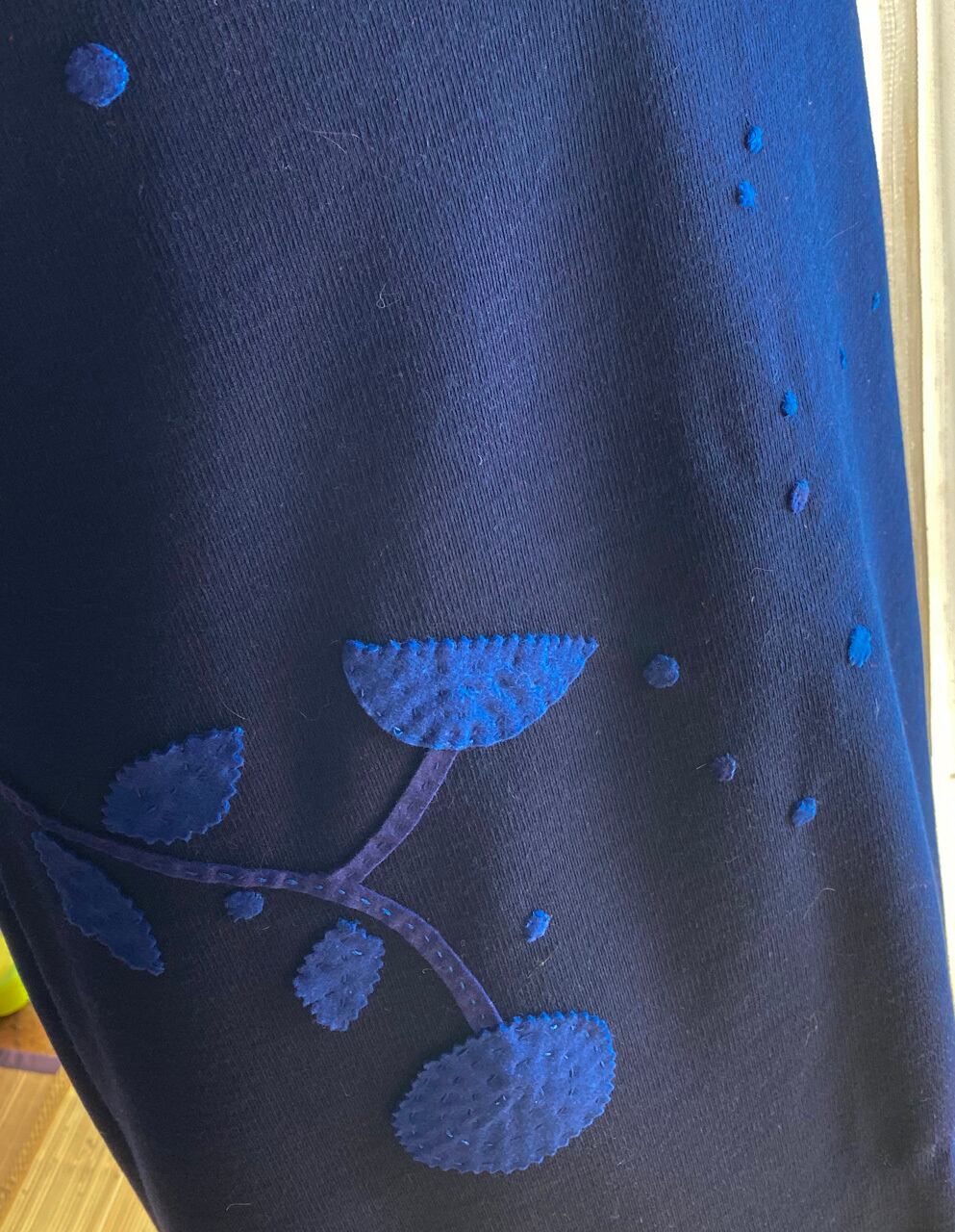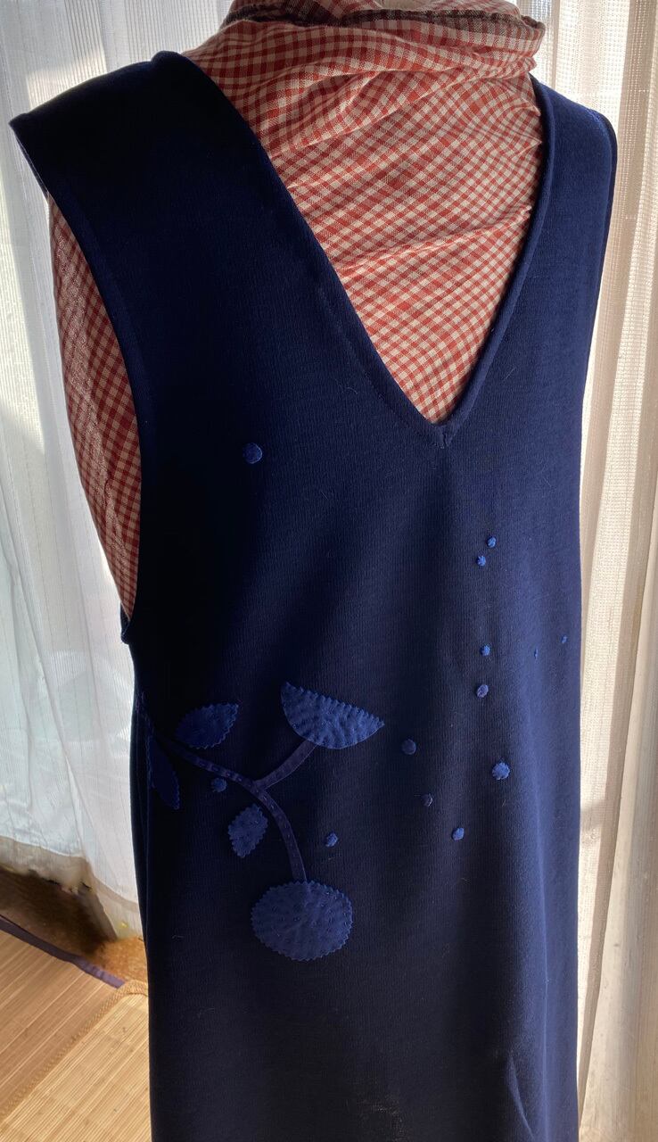 穴の空いたところをアップリケで覆いながら、全体に絵を描くように手仕事を施しました。